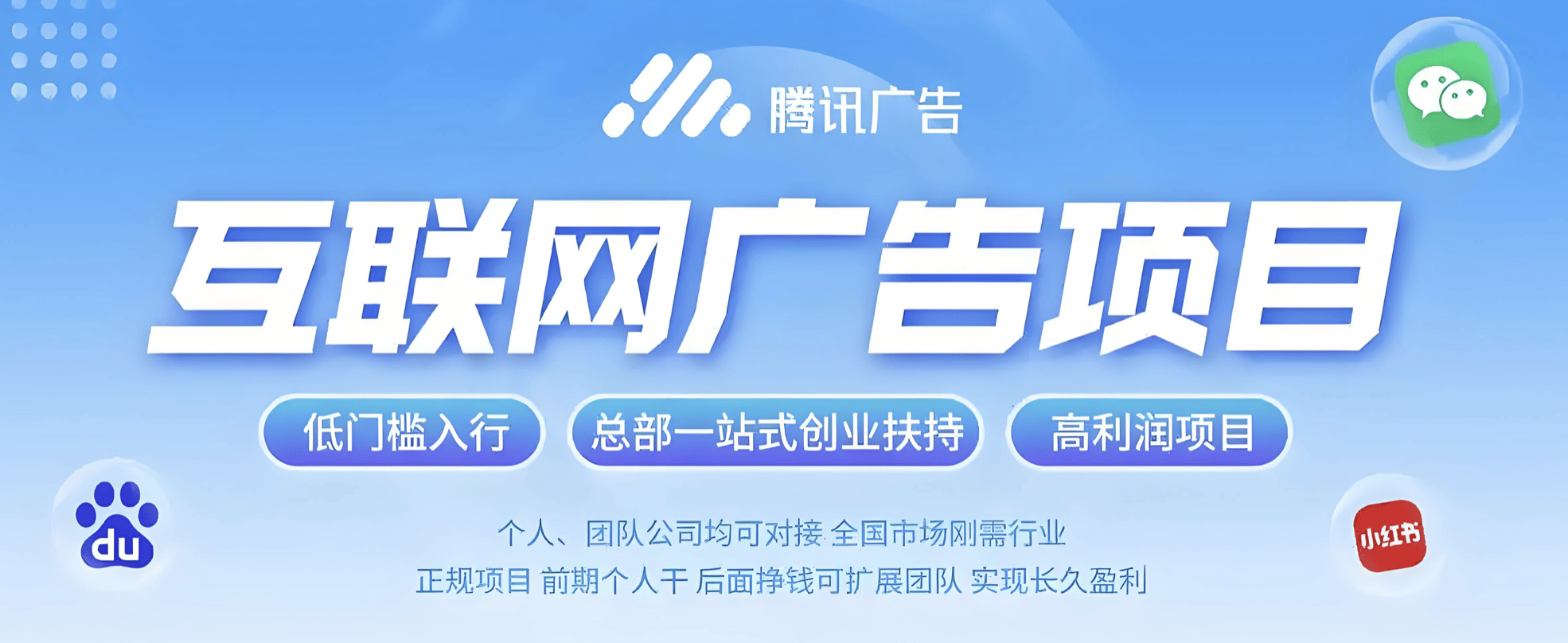 我们做互联网告白这个项目就是对接那些有宣传推广需求的商家企业,小我创业月入5万摆布;这些都是需要通过告白来进行宣传的,全告白代办署理加盟 互联网轻资产创业 互联网告白代办署理加盟 小我低成本项目告白做古以来就是市场刚需,部门平台以至可达50%以上